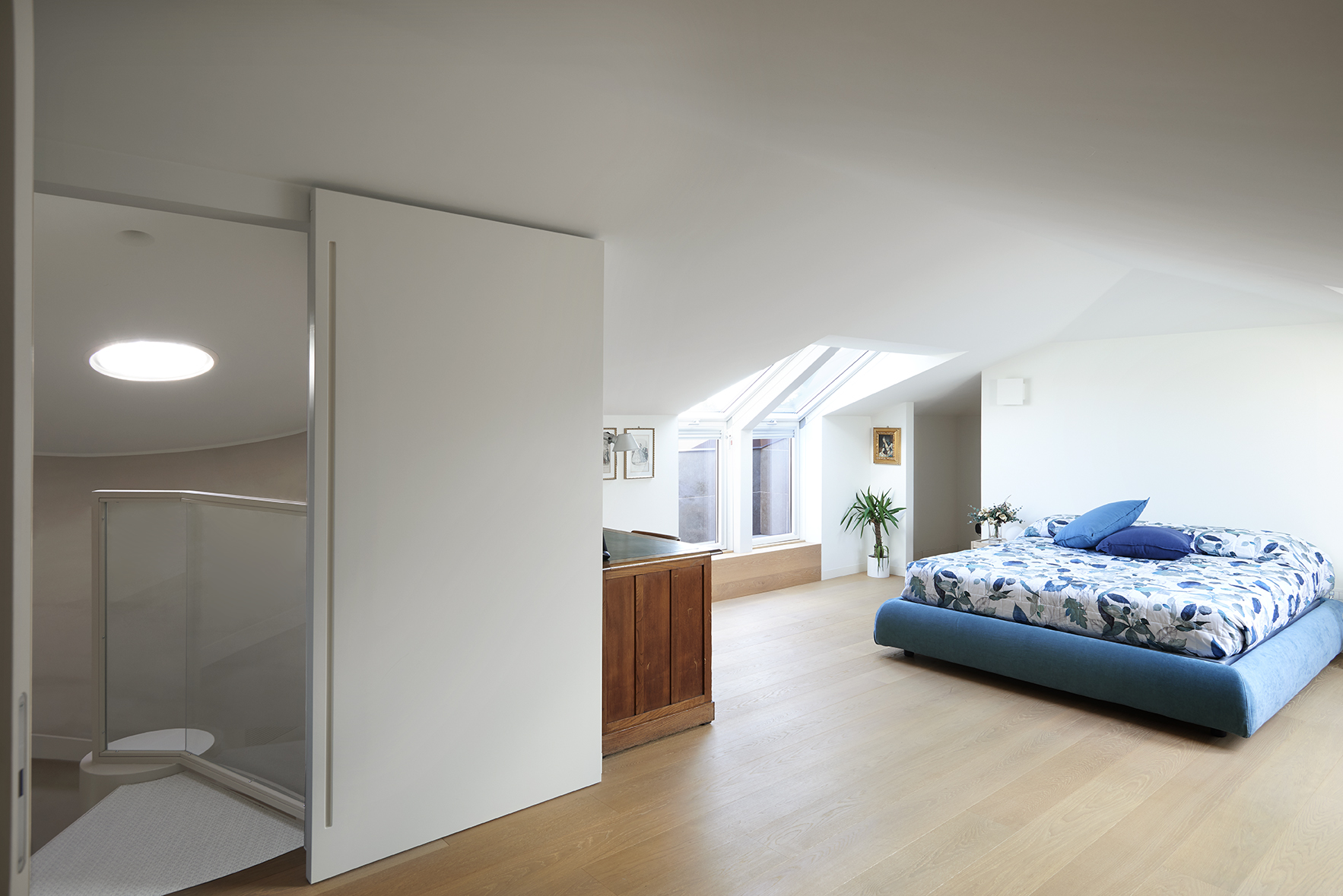 In questa villa alle porte di Milano il sottotetto era buio. Per renderlo luminoso e ricavarci la zona notte sono state inserite delle finestre per tetti che, unite a un elemento verticale apribile, hanno anche reso possibile l'accesso a due terrazzini sul tetto.