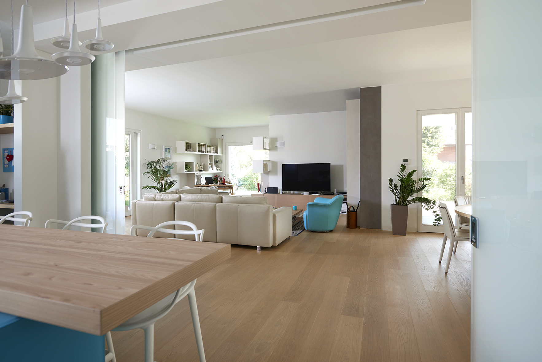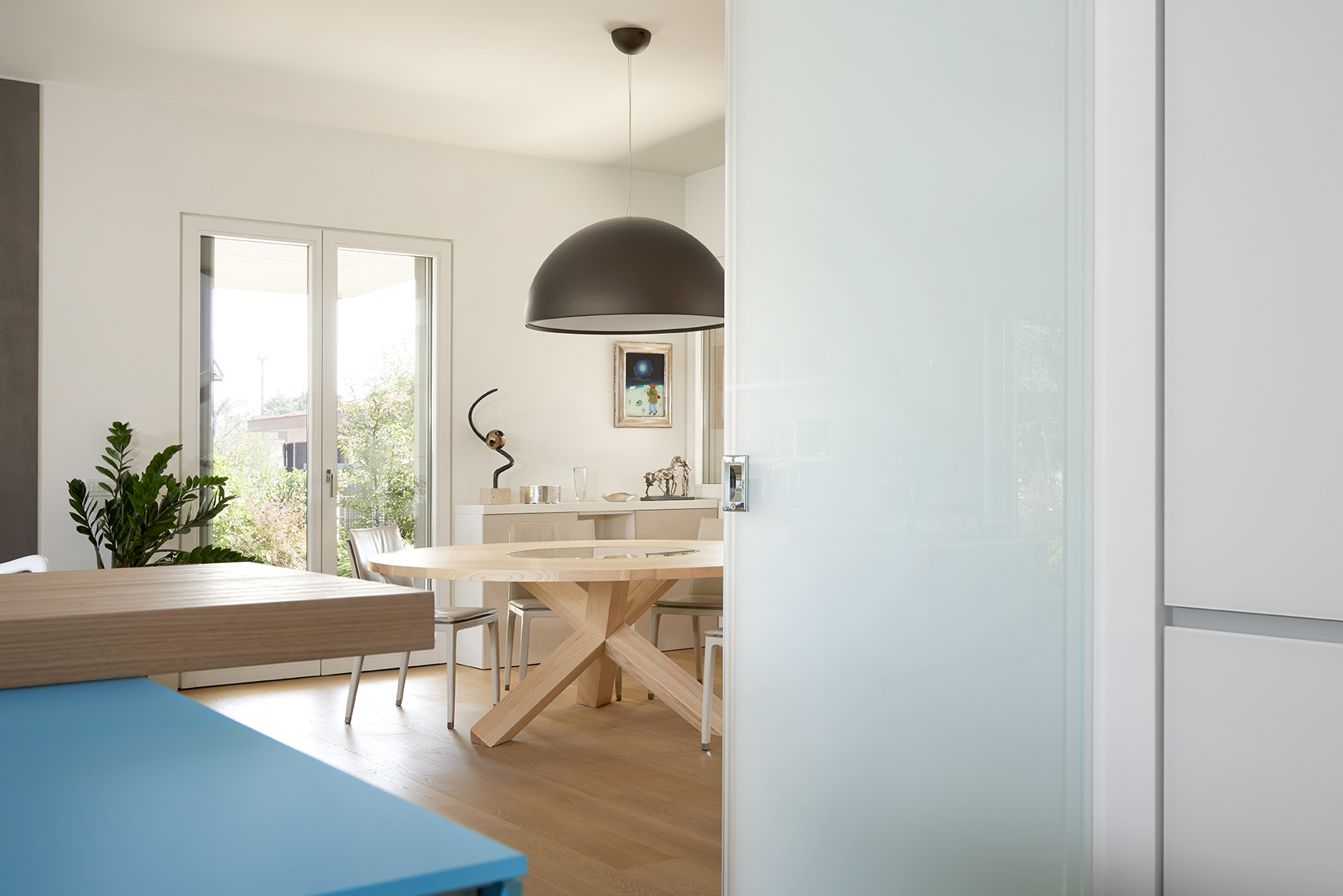 Abbiamo realizzato una casa immersa nel verde per avere la possibilità soprattutto nella bella stagione di viverla tanto dentro quanto fuori. Abbiamo lavorato con l’architetto all’apertura di nuove vetrate e all’ampliamento delle vetrate già esistenti. Penso che la luce naturale e il verde influiscano in maniera positiva sul vivere la casa.