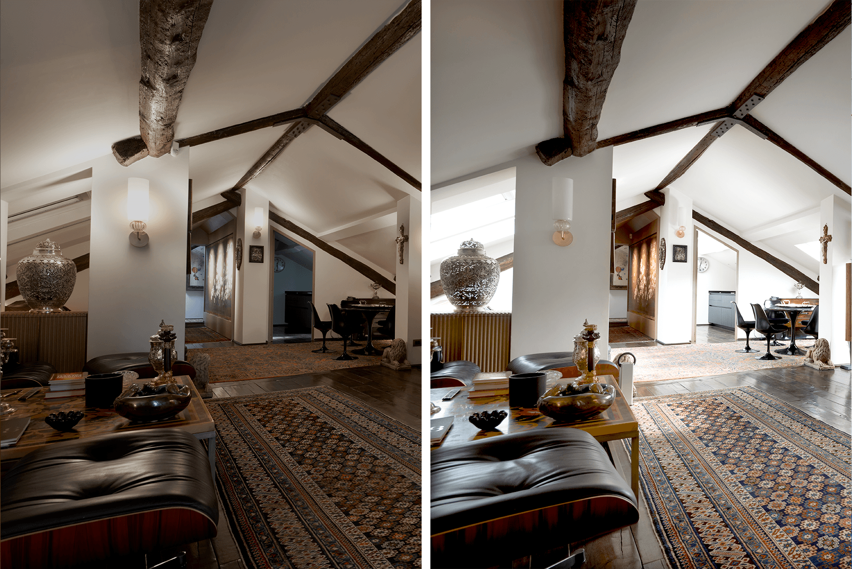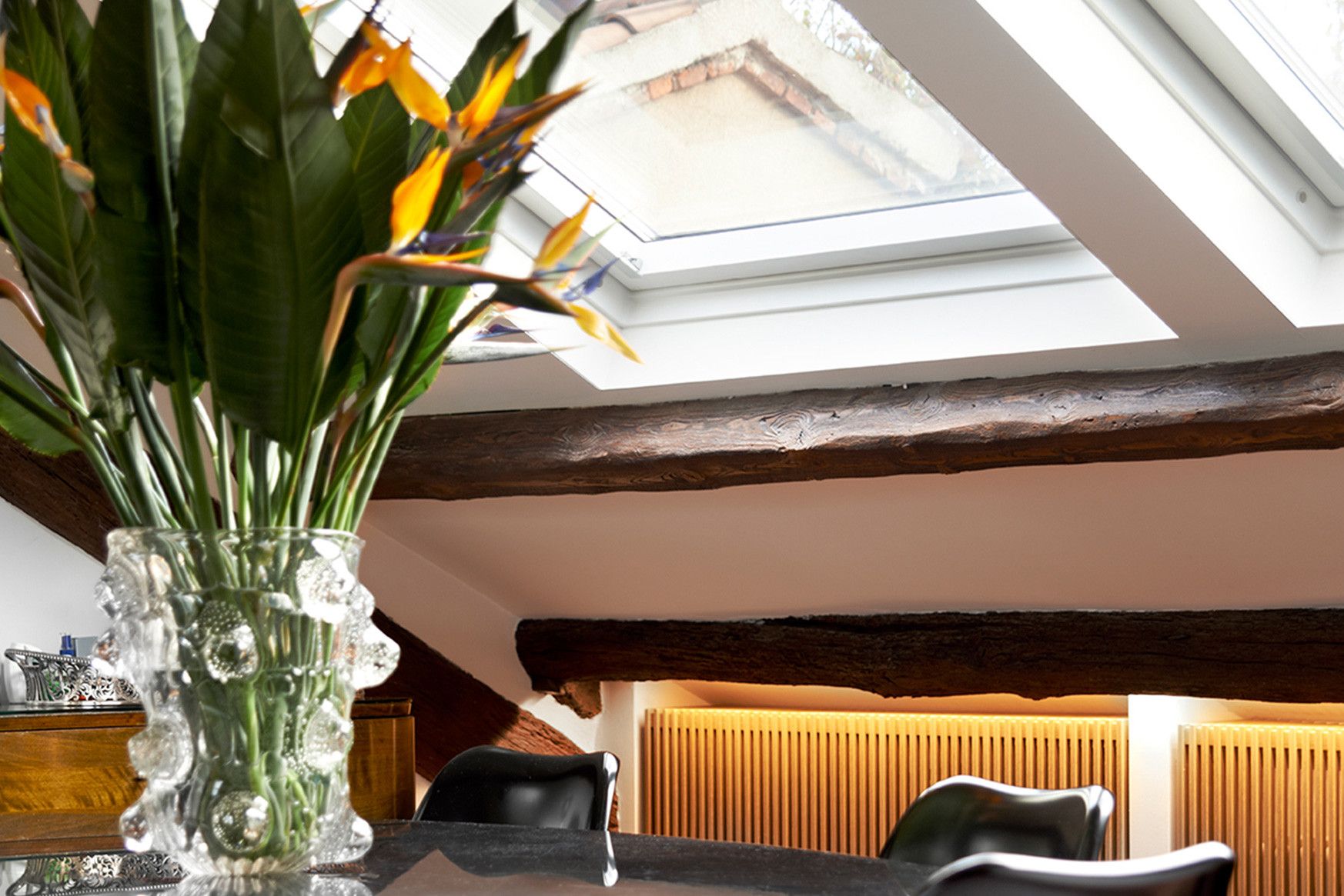 Prima dell'intervento l'appartamento era molto buio. Grazie alla ristrutturazione e alle soluzioni di illuminazione studiate con VELUX gli spazi si sono allargati, sembrano più grandi, si vive meglio. Ora la luce cambia continuamente, sia di giorno sia di notte, creando un'atmosfera speciale.