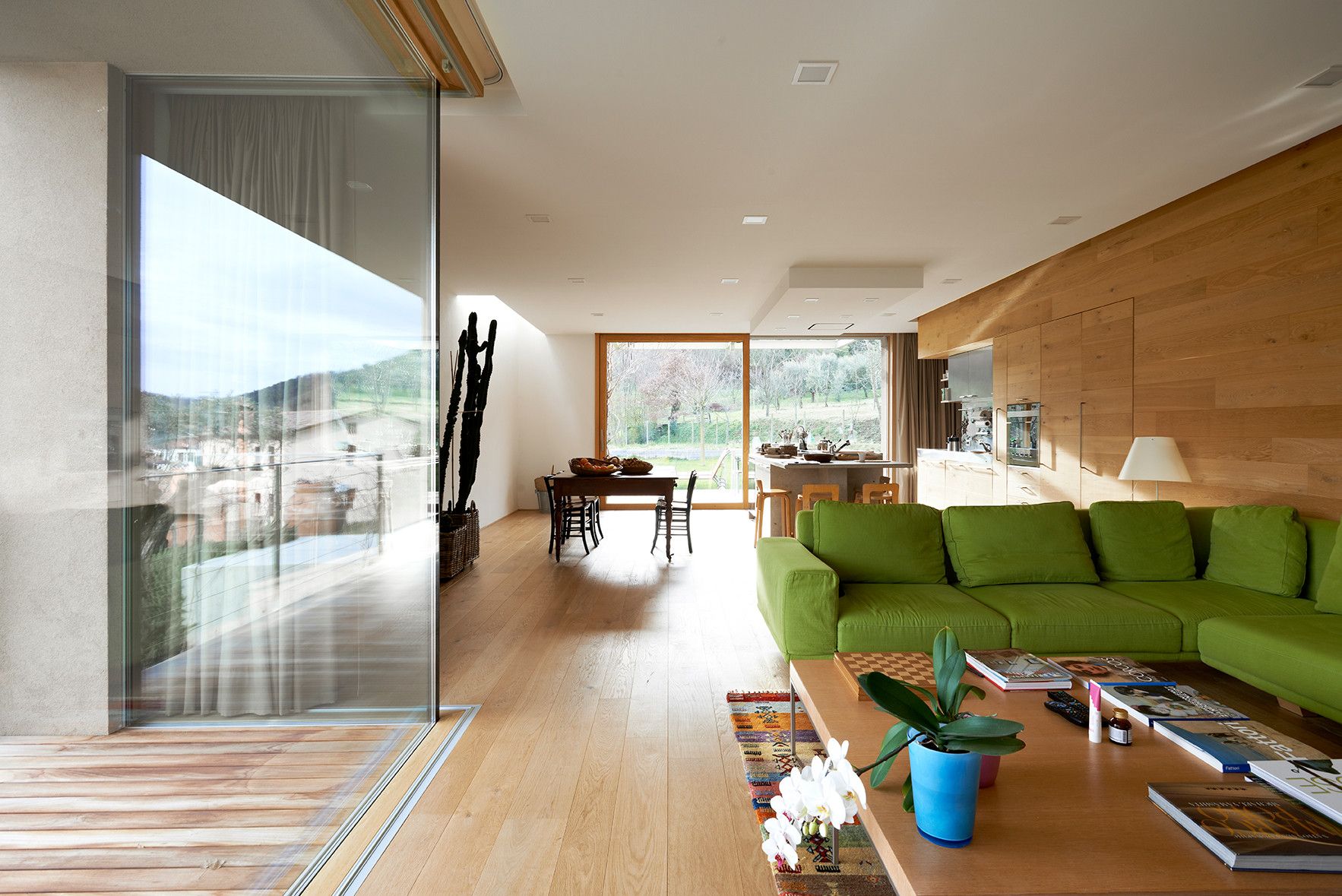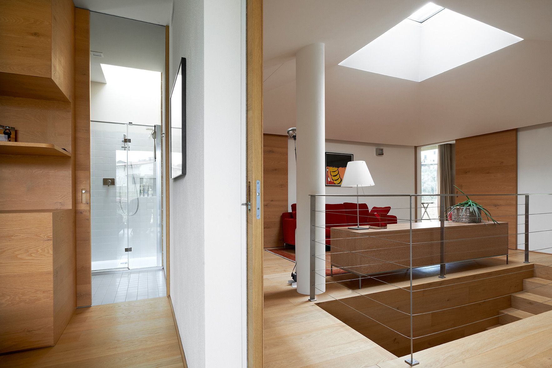 In questa abitazione la forte relazione tra l'interno e l'esterno, con le sue continue variazioni di luce, è stata ottenuta con l'inserimento di grandi aperture verticali, in abbinamento a finestre in copertura. Ne risulta una distribuzione ottimale della luce in tutti gli ambienti.