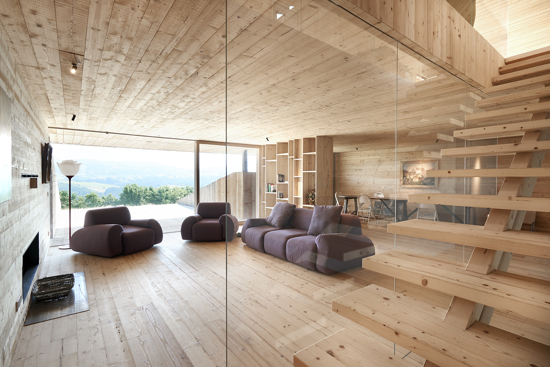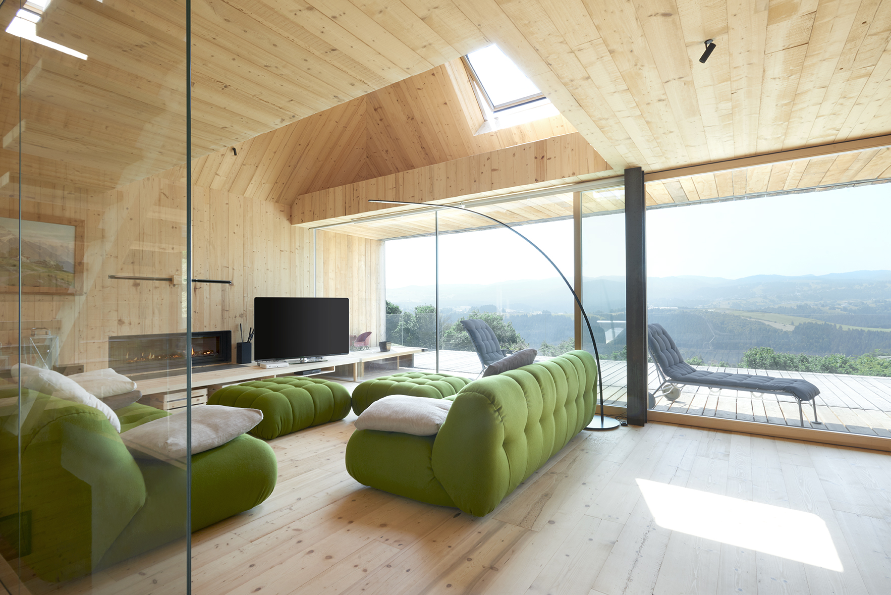 In questa casa in legno, sviluppata su tre piani, immersa in un contesto naturalistico meraviglioso, le aperture in facciata e sul tetto permettono di vivere in costante contatto con la natura e il panorama circostante.